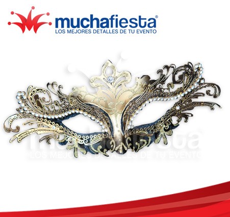 Antifaz elaborado en Pasta y decorado con cristales, Se sujeta con listón Tamaño Unitalla, Se vende en colores morado y oro